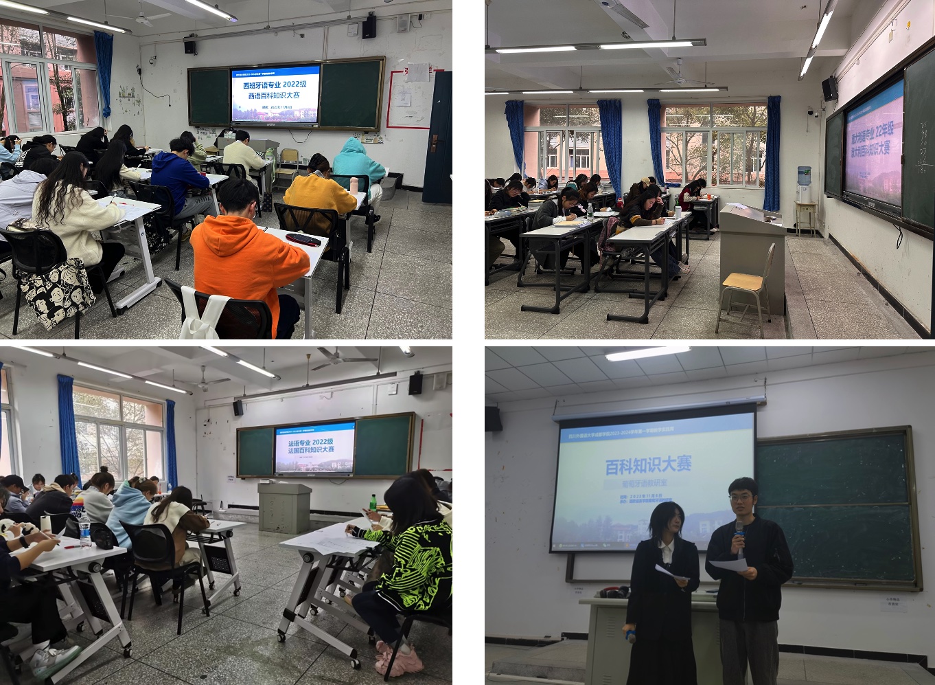 为加深学生对语言文化的理解,增强对文化差异的敏感性,扩大知识面,巩固和提高外语水平,培养学生的跨文化交际能力,更好地掌握和运用外语,我院于11月8日举办了国家百科知识大赛。2022级法语、西班牙语、意大利语和葡萄牙语各专业全体学生参与比赛。
